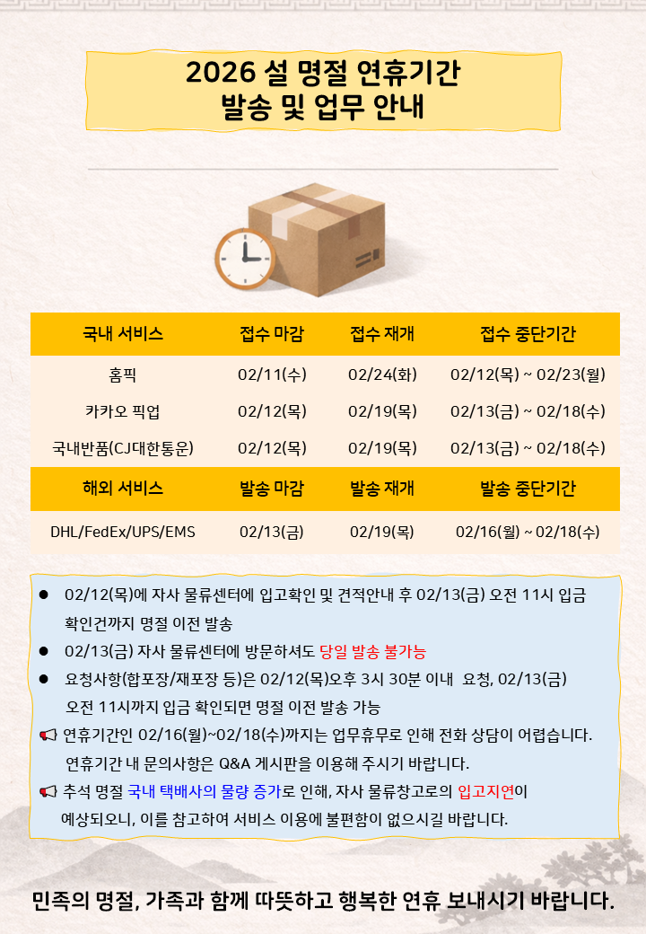 📢 2026 설명절 연휴기간 발송 및 업무 안내